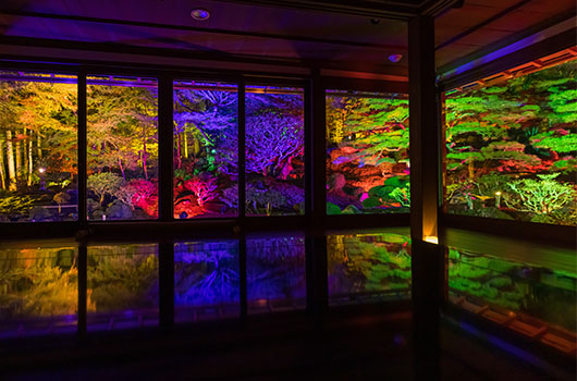 9月7日まで週末限定で夏のライトアップを実施しています。主屋に置かれた机に景色を反射させ、リフレクション写真の撮影を楽しむことができます。